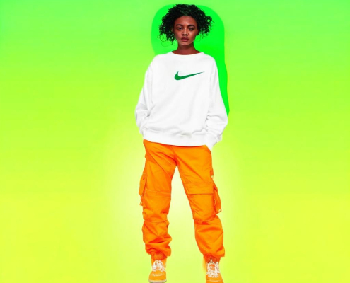 RegularNike Air’s bold campaign: a model leans back in white sweatshirt and orange cargo pants
