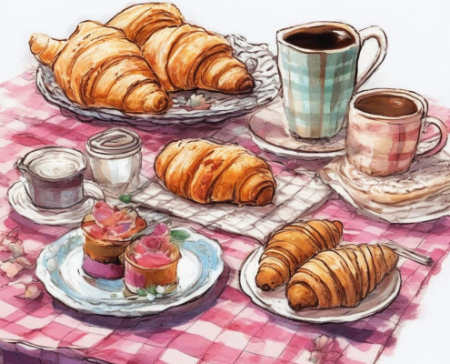 A sketch-style cafe table with checkered cloth