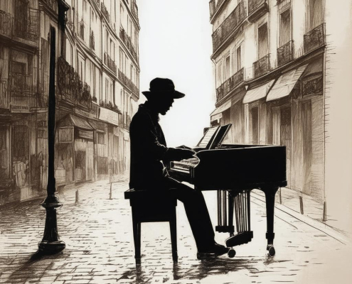 RegularA coffee-toned silhouette of a street pianist on a Paris sidewalk