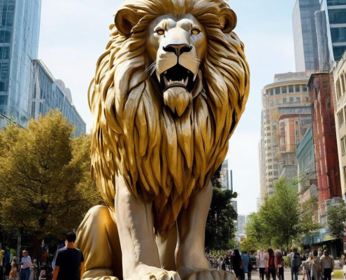 RegularA majestic 5-story lion stands tall in the city