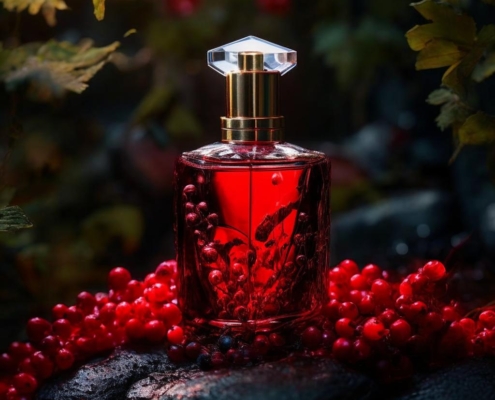 RegularA vibrant perfume bottle with red liquid rests on black rocks amid berries in a forest