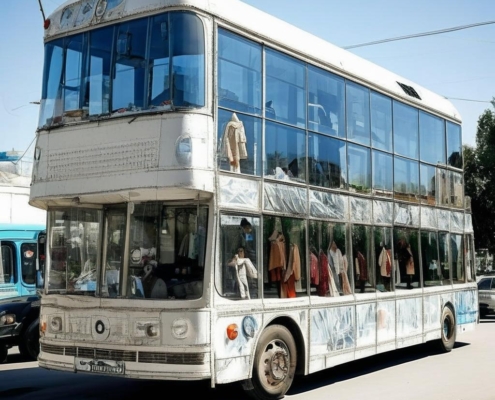 RegularA three-story glass boutique bus glides through Tashkent’s sunny streets