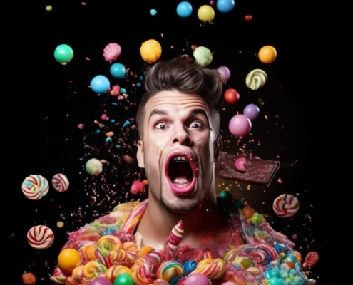 RegularA handsome man playfully bites into a deodorant as colorful sweets float around him against a stark black background
