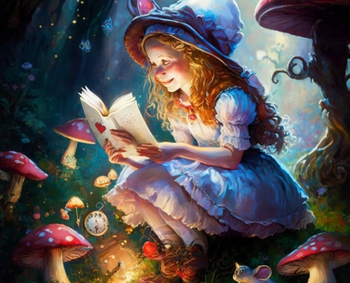 RegularA smiling Alice reads a glittering book atop a mushroom in Wonderland