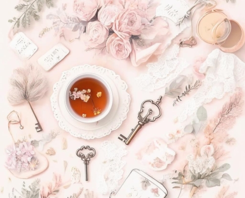 A cozy cottagecore flatlay with soft-hued flowers