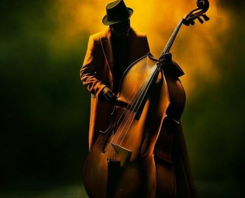 A mysterious jazzman in a flowing burnt orange coat plays a double bass on a dramatic edge
