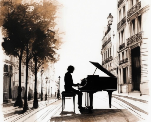 A lone pianist’s silhouette in coffee tones plays on a Parisian sidewalk