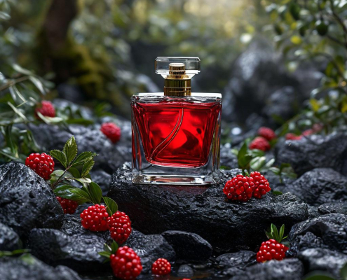 AI ArtA hyper-realistic perfume bottle with red liquid rests on black rocks among berries in a soft-lit forest. Shot professionally on a Canon R5