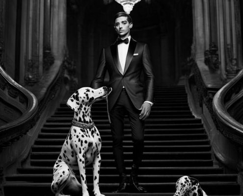 RegularAn avant-garde tuxedo-clad model confidently holds a colossal Dalmatian’s diamond-studded leash on the MET Opera’s grand staircase
