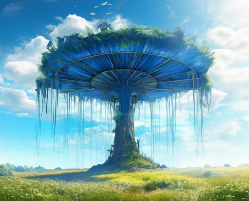 Regular梦幻草原上,巨型藤蔓吉他矗立蓝天之下,高分辨率广告海报展现极致细节与奇幻氛围。