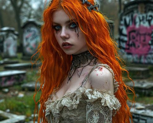 AI ArtA grungecore vampire bride with fiery orange hair haunts a graffiti-scrawled graveyard