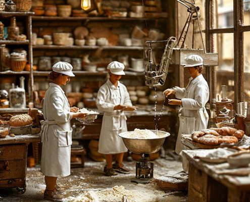 AI ArtTiny bakers in white hats guide a miniature crane pouring flour into a bowl