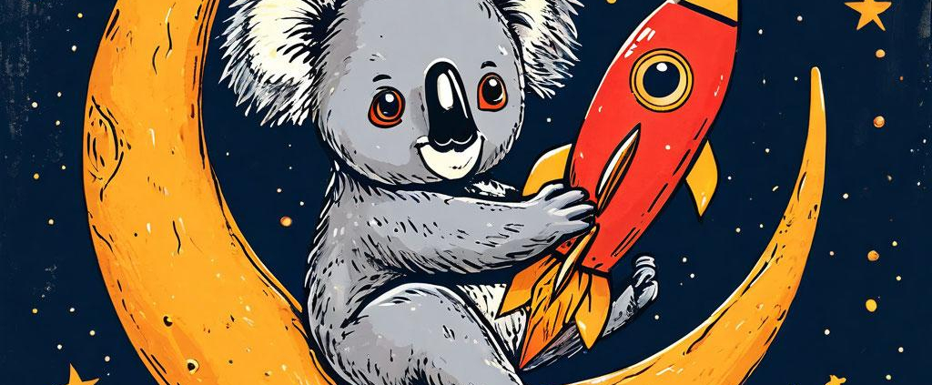 A 1950s-style koala on a crescent moon holds a retro rocket