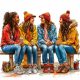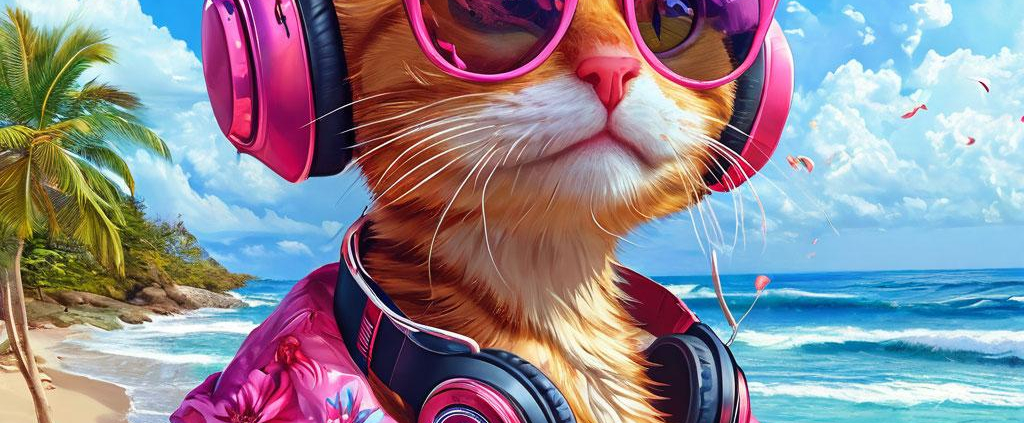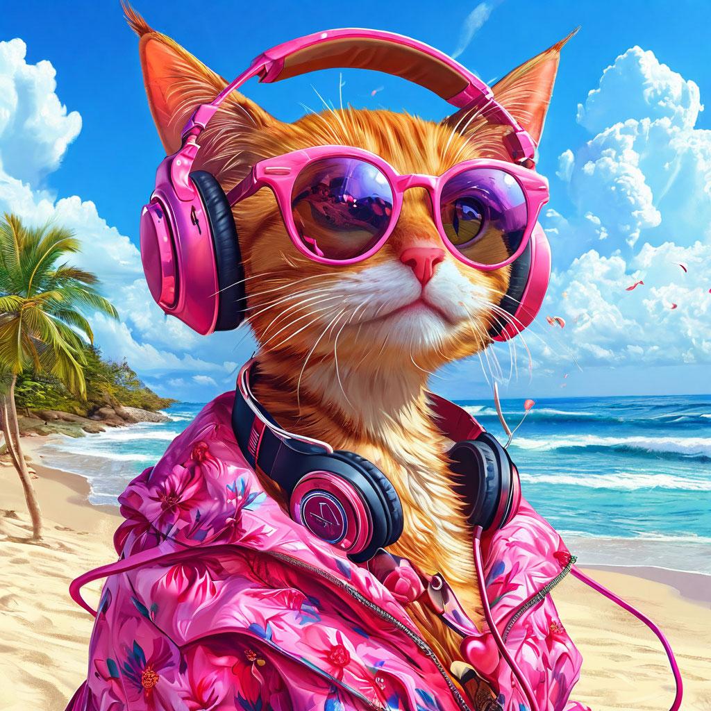 A chic cat in pink shades and a floral outfit grooves with headphones on a sun-drenched beach—vibrant 3D fantasy art bursting with color and light