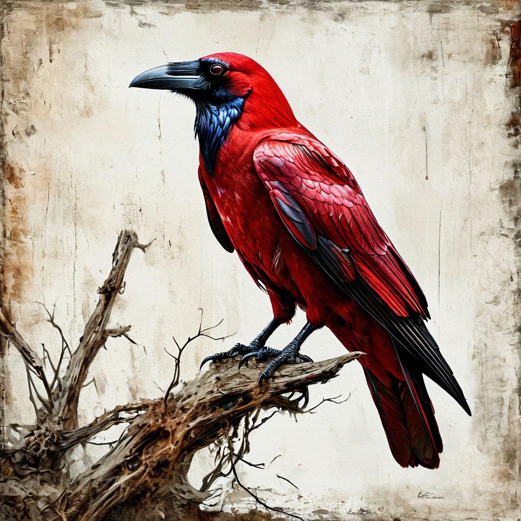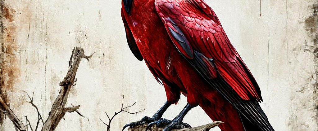 A crimson “RAVEN” blazes above a skeletal perch