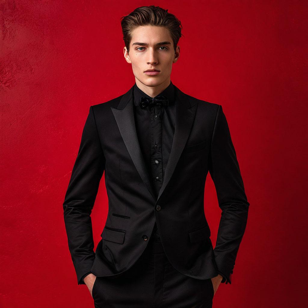 A European model in a sharp black suit poses confidently against a dramatic red backdrop