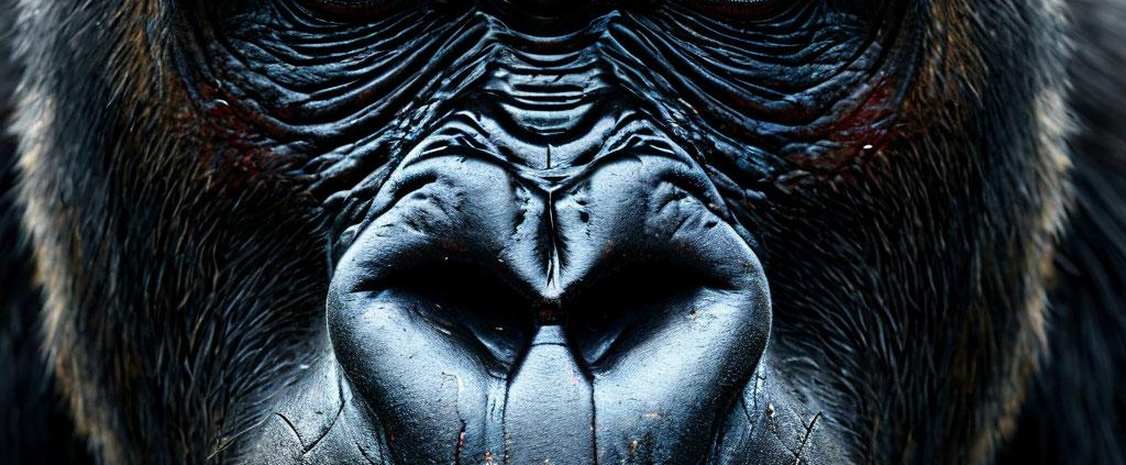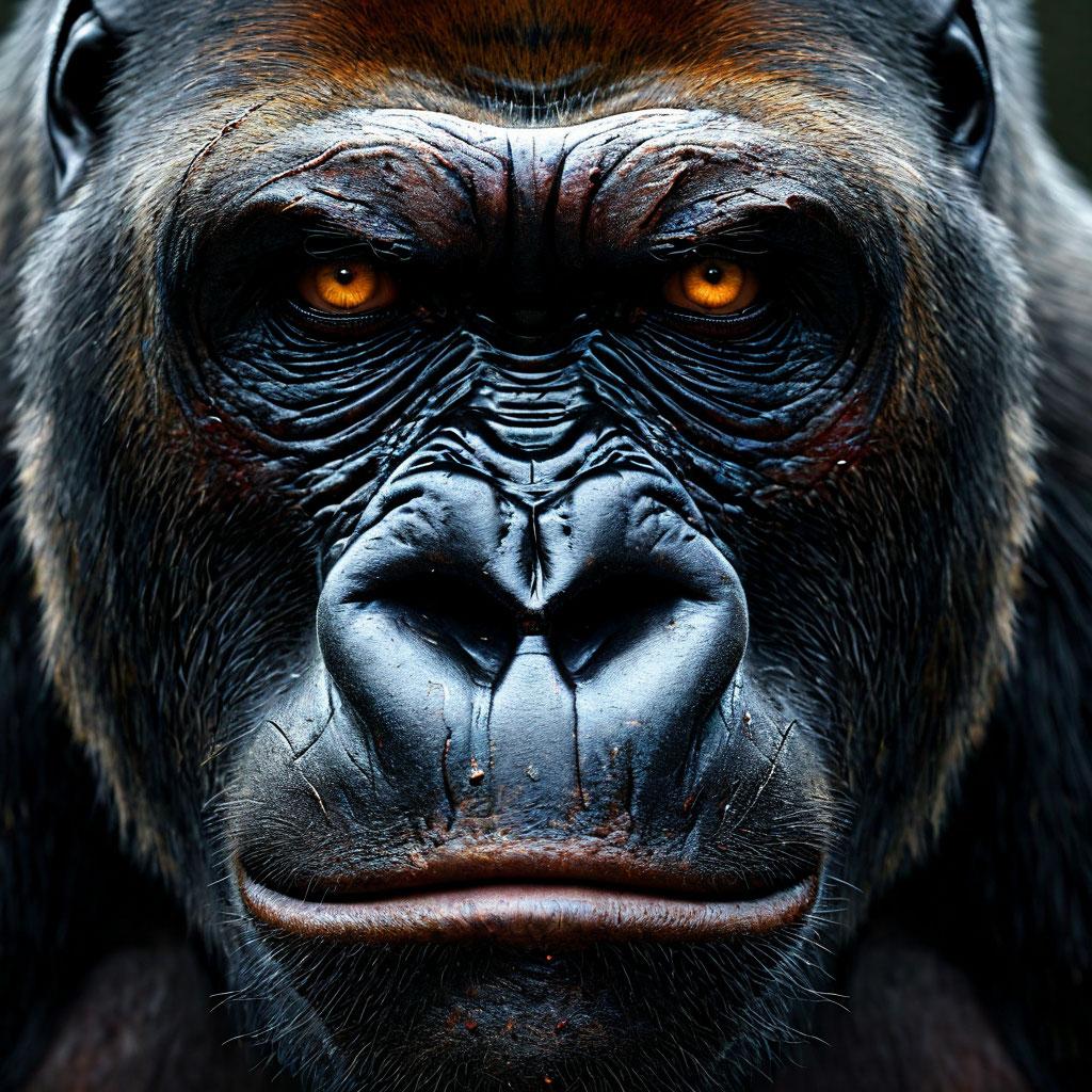 A fierce gorilla glares with scars etched across its face