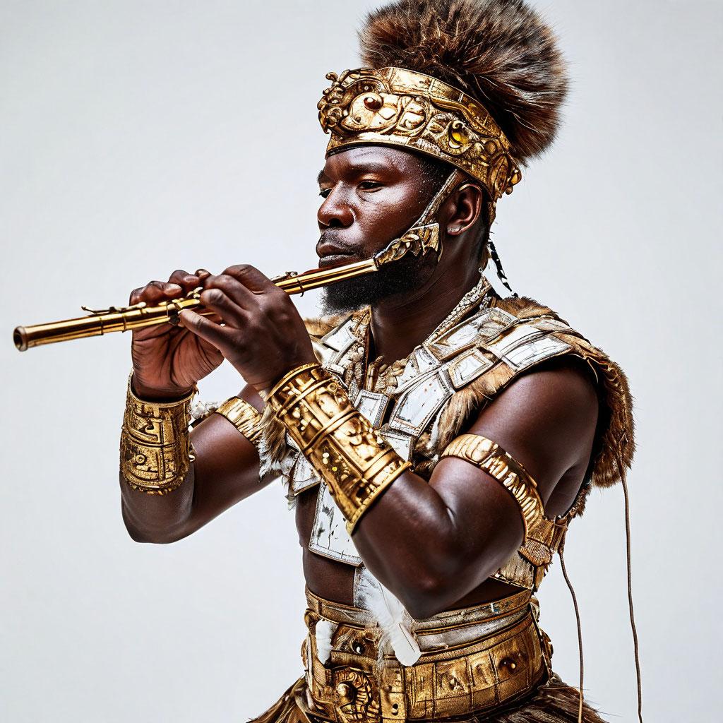 A gilded Zulu warrior in marble armor plays a flute