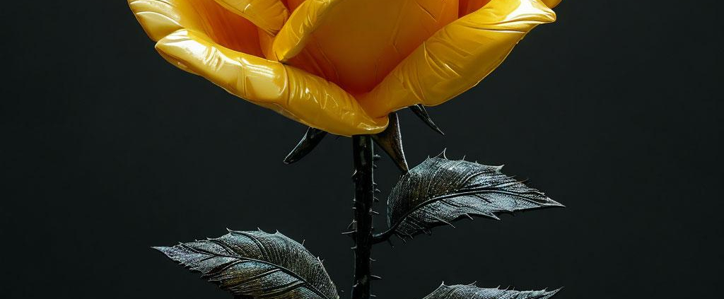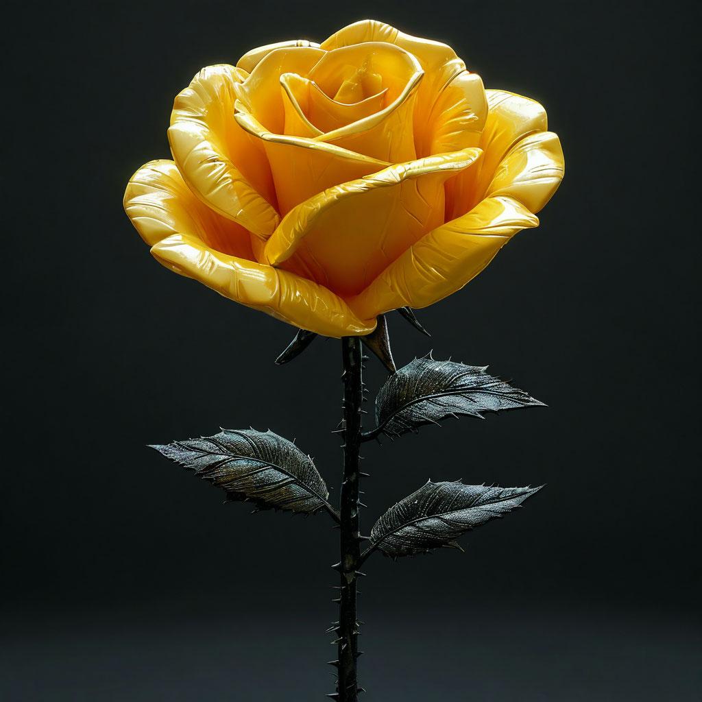 A glossy yellow inflatable rose with a thorny black stem