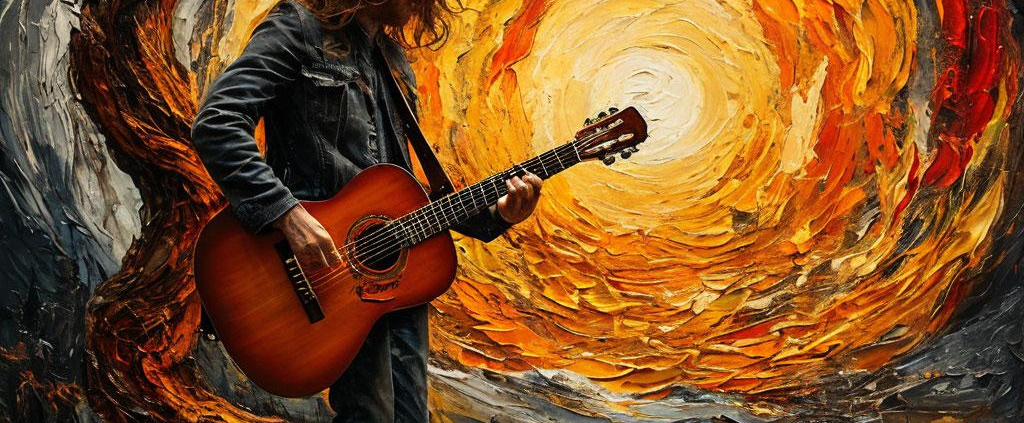 A guitarist stands rooted like an oak; a dancer swirls with fiery grace—Earth and Air channeled through bold