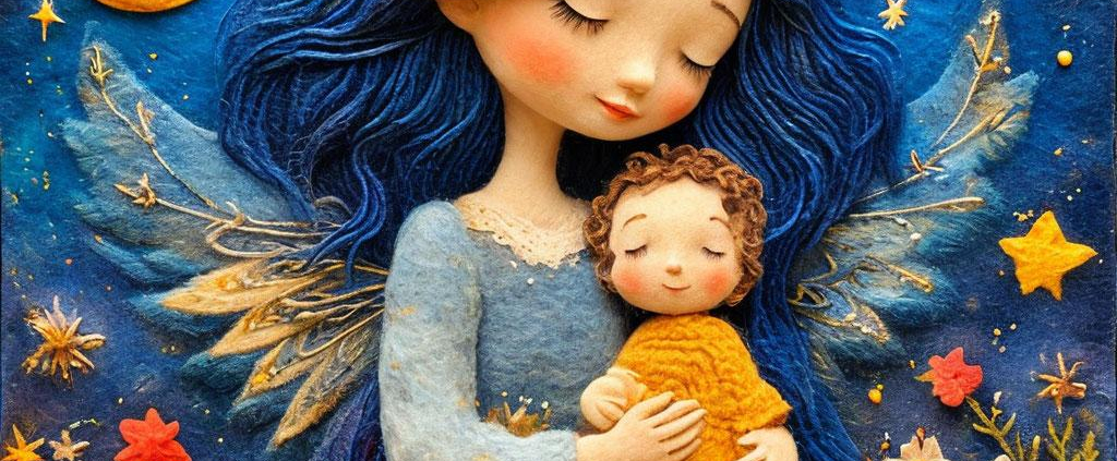 A handcrafted wool felt painting in soft Morandi tones depicts a blue-haired angel cradling her child among dreamy stars
