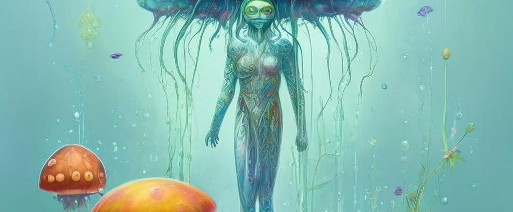 A hyper-detailed water humanoid stands on a dewy blade of grass