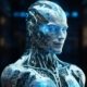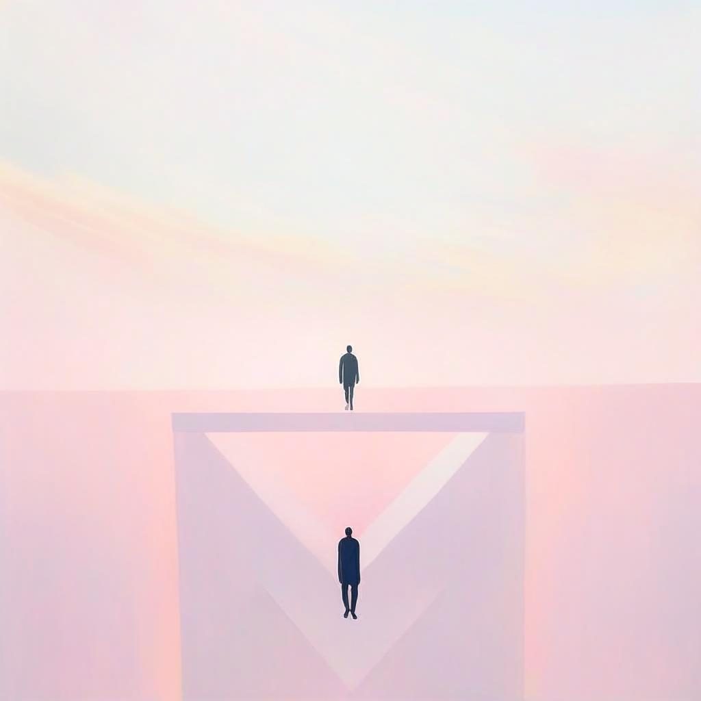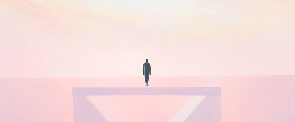A lone figure drifts through floating geometric structures under a soft pastel sky