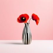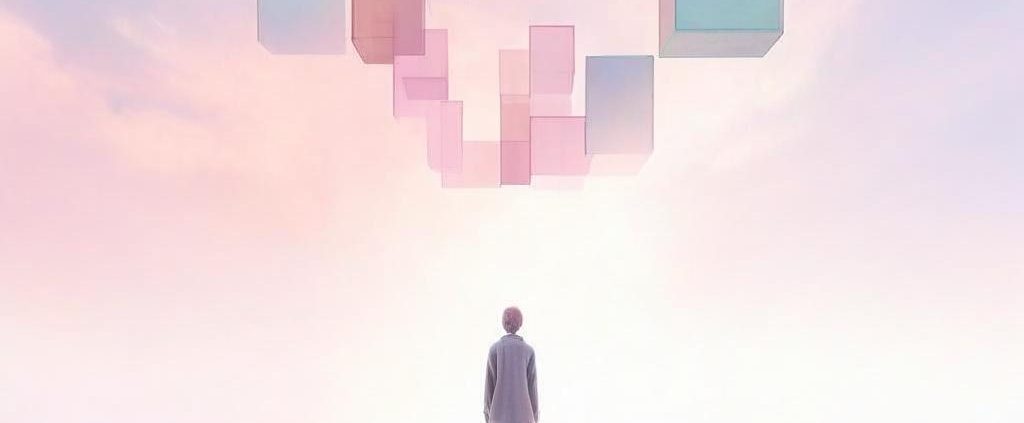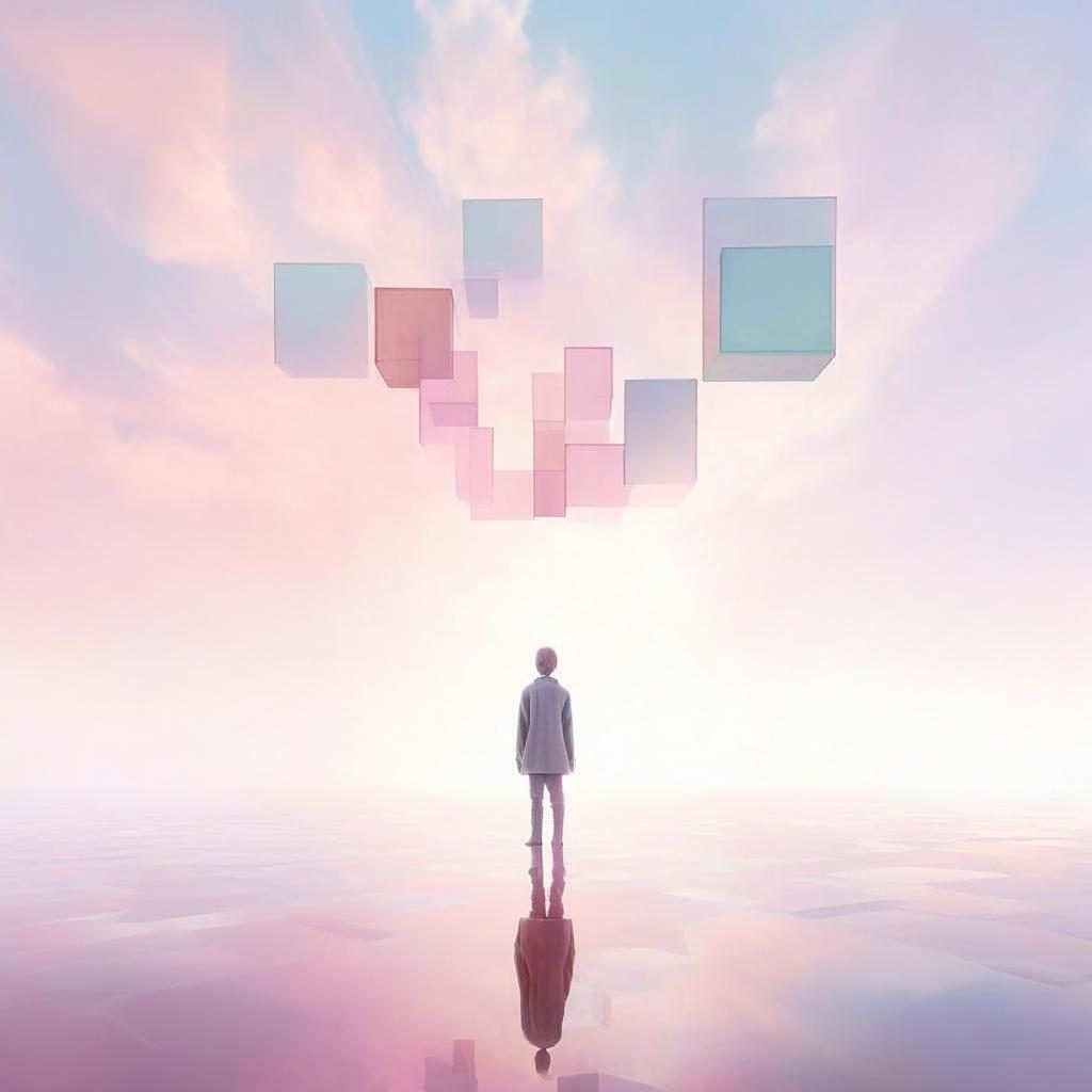 A lone figure stands beneath floating geometric forms in a soft pastel sky