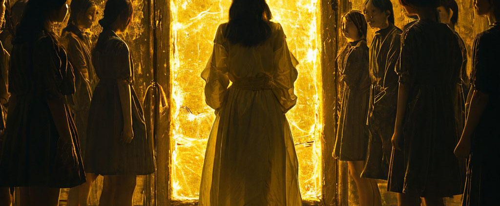 A lone Korean woman stands in a dark room