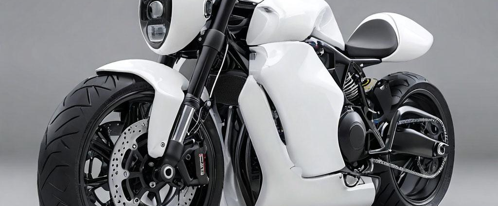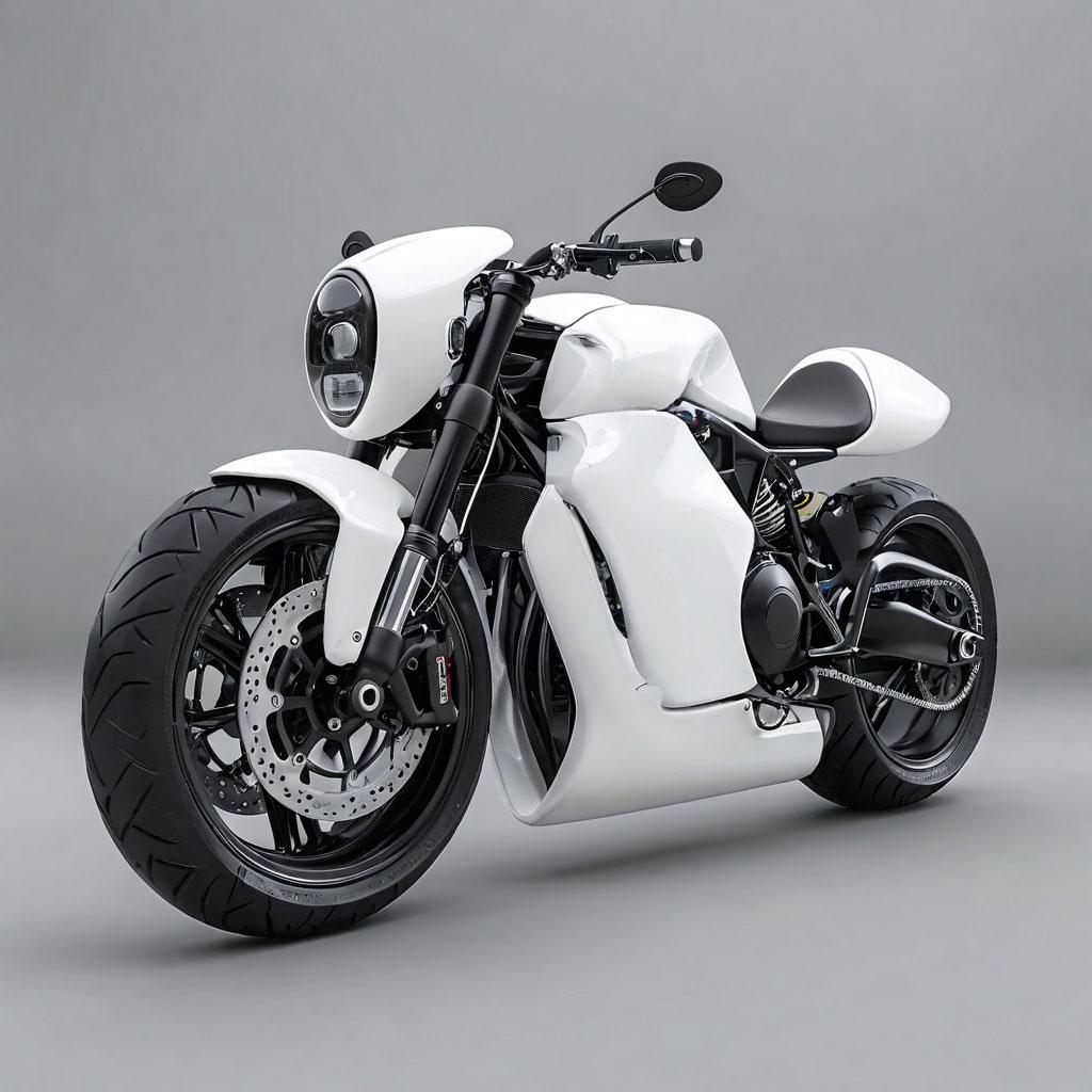 A minimalist Y2K-styled motorcycle in sleek white matte plastic
