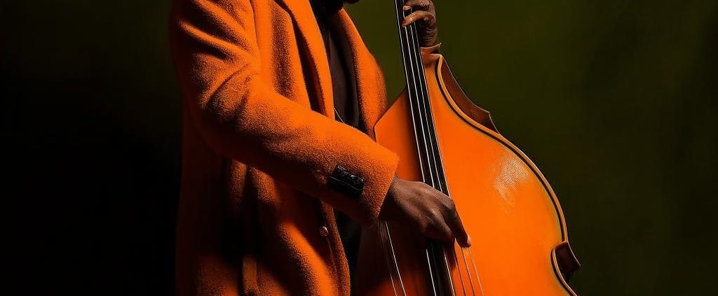 A mysterious jazz bassist in a flowing orange coat strikes a dynamic pose against an olive backdrop