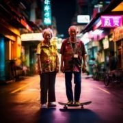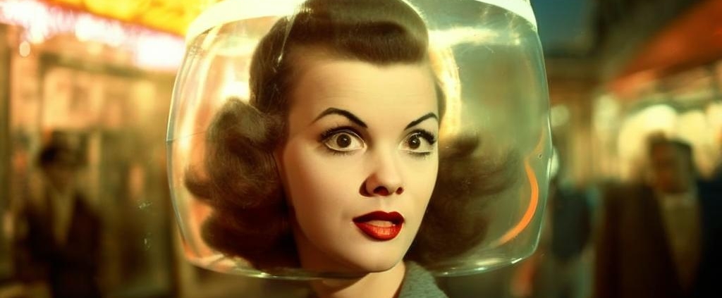 A quirky 1950s portrait: a woman’s head playfully encased in a glowing aquarium on a retro street