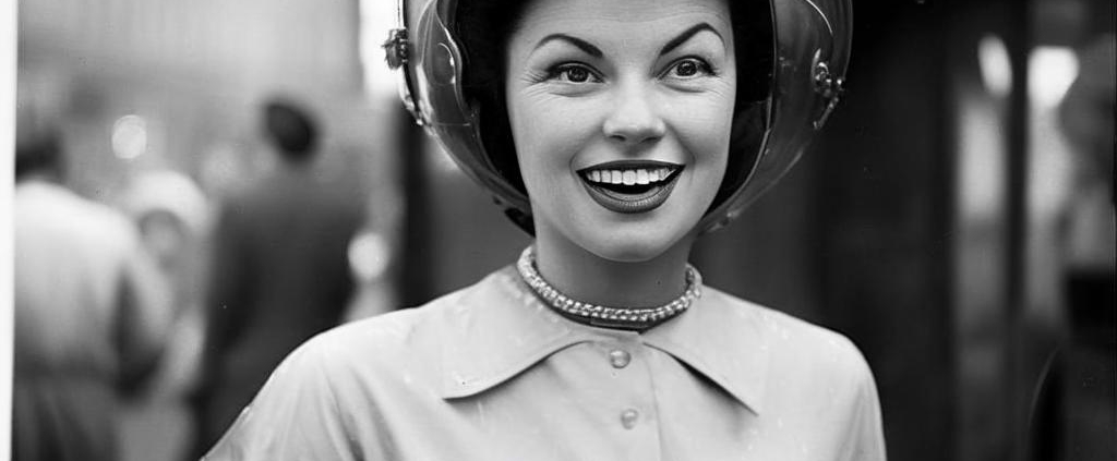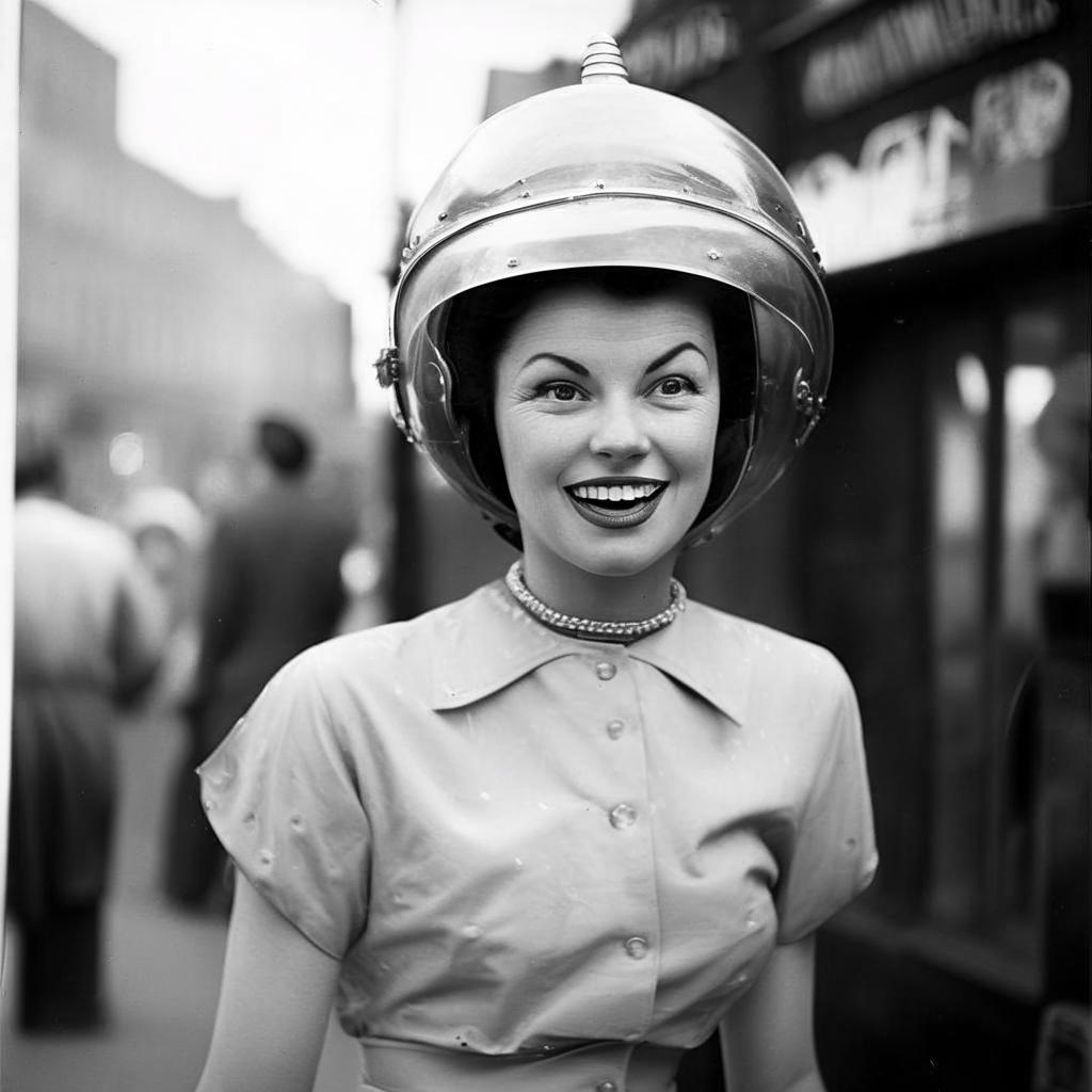 A quirky 1950s street portrait: a woman with an aquarium helmet