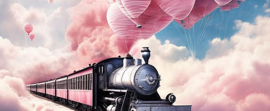 A silver-era train floats through rosy clouds and balloons
