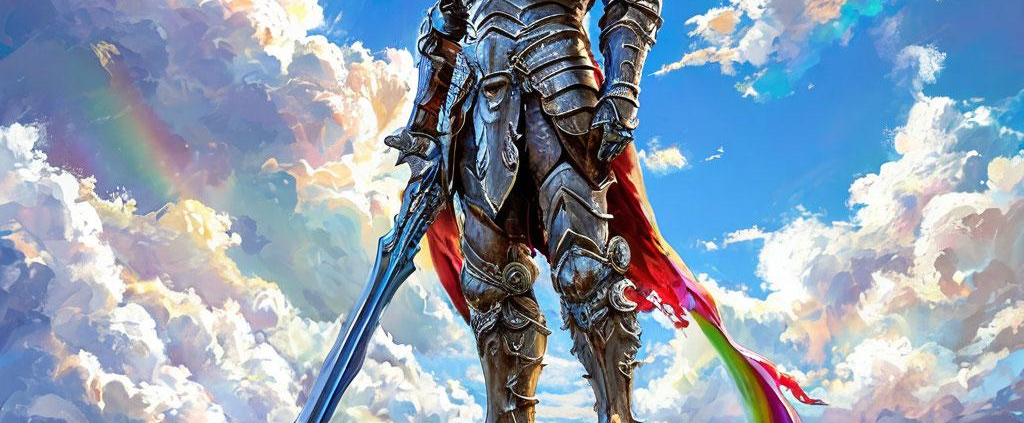 A silver warrior stood upon a giant sword