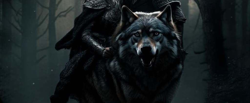 A Slavic couple rides a majestic wolf through a mystical forest.