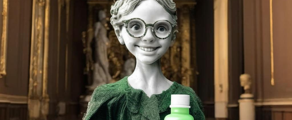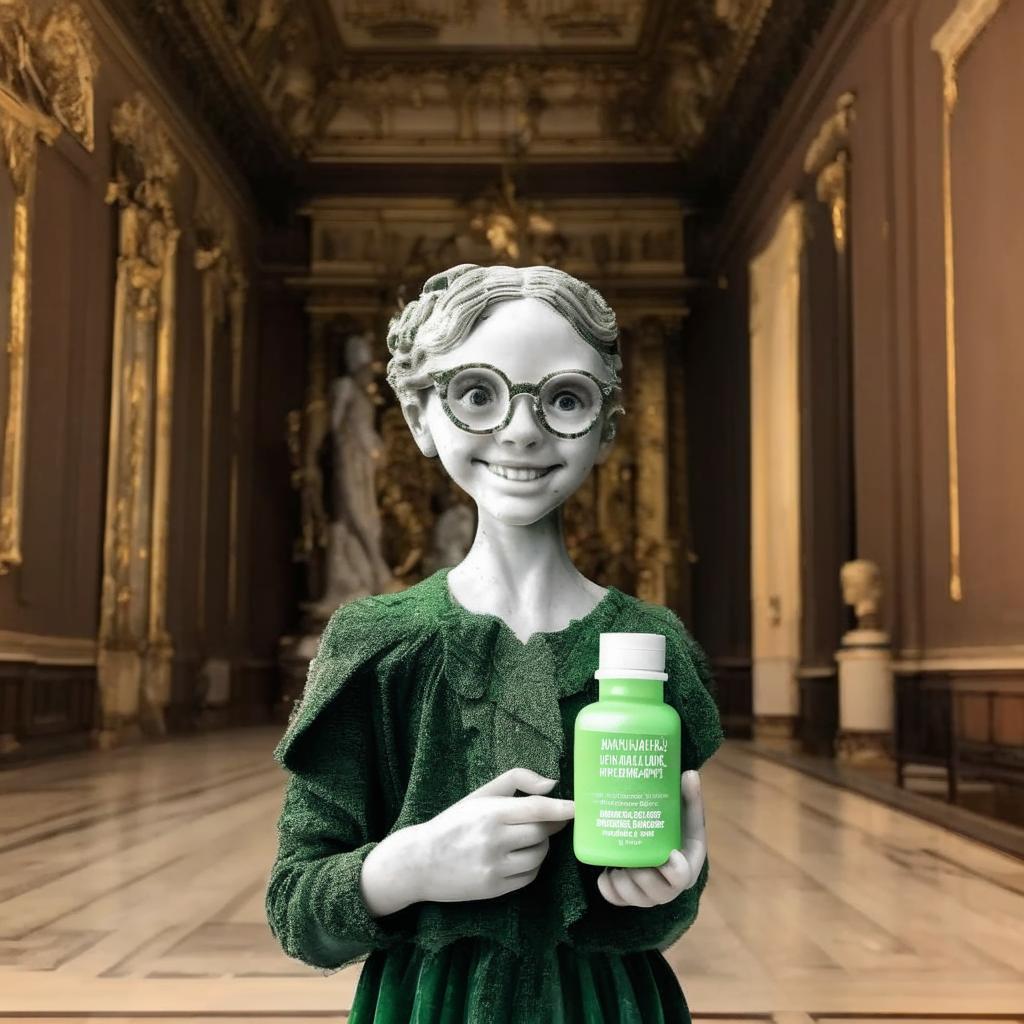 http://promptline.art/wp-content/uploads/2025/11/image_a957c6d9-0e65-478e-8fc7-eecdca29c79e.jpg10241024promptlinehttps://promptline.art/wp-content/uploads/2025/04/logo12-300x138.pngpromptline2025-11-26 16:52:332025-11-26 16:52:33A smiling marble girl with chic glasses and hairstyle holds a small green vitamin bottle against the Hermitage’s brown hall backdrop