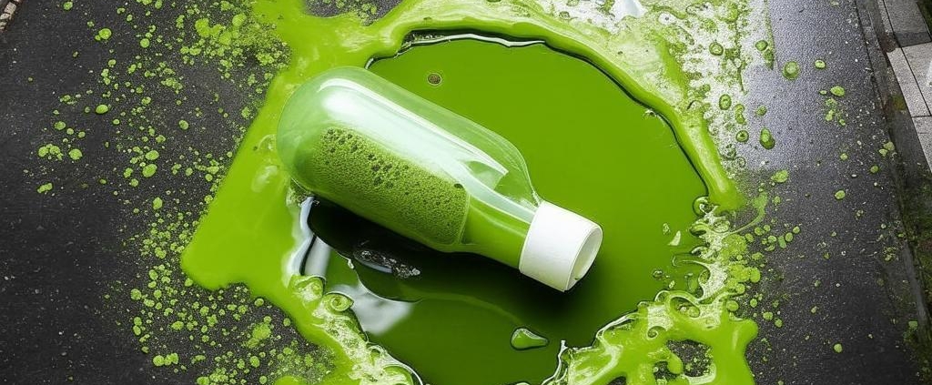 A spilled iced matcha latte creates a green mess on a clean Tokyo street