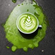 A spilled matcha latte creates a green puddle on a Tokyo sidewalk