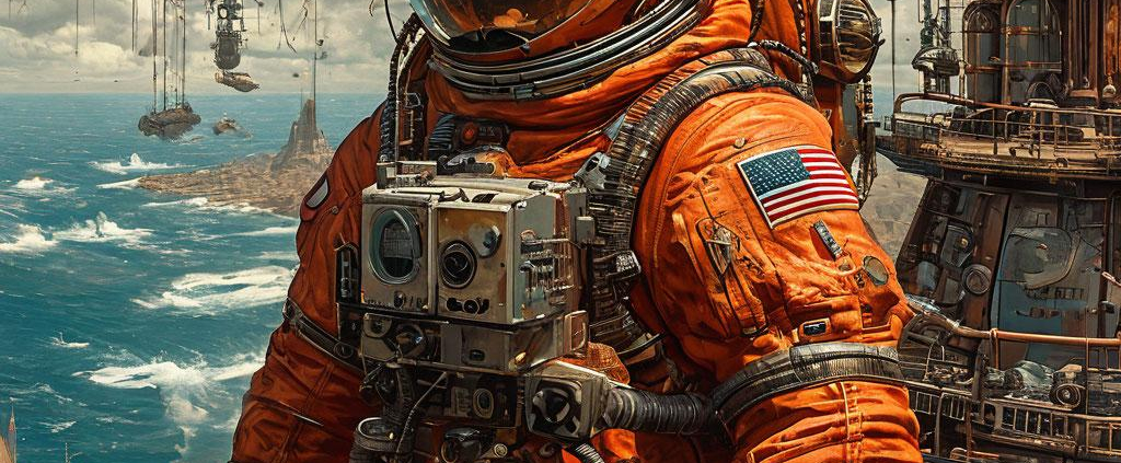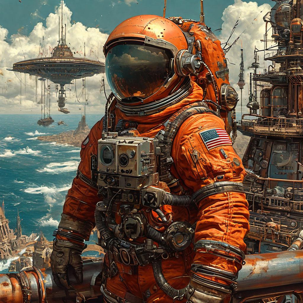 A steampunk astronaut merges with their intricate ship in 32K UHD