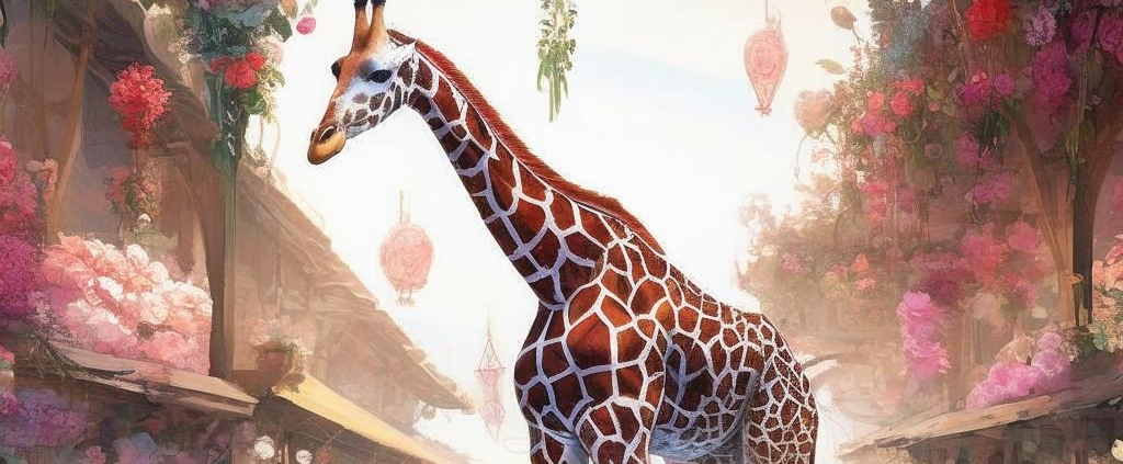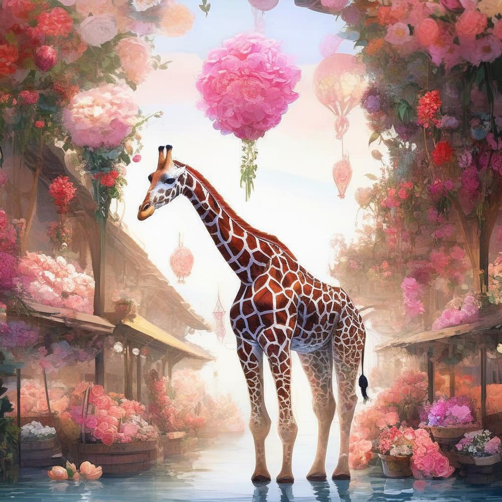 A tall giraffe of rose stems and peony blossoms browses a floating flower market