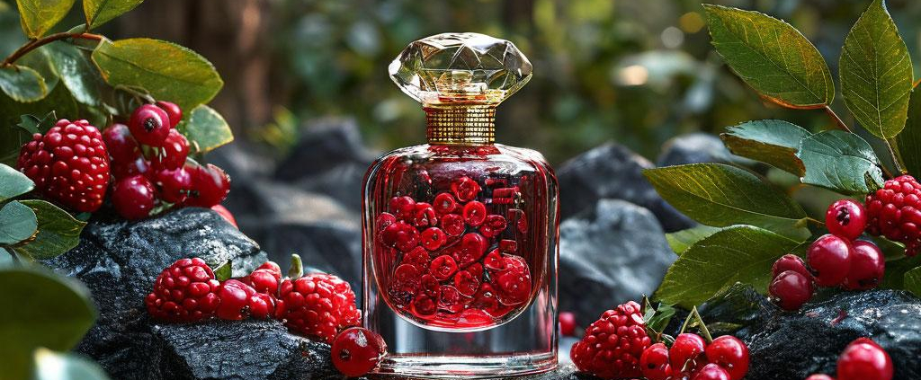 A vibrant perfume bottle rests on dark stones