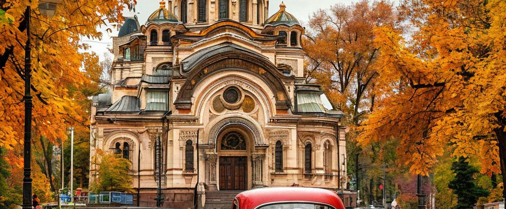 A vintage red car passes a domed church on a Sofia street