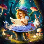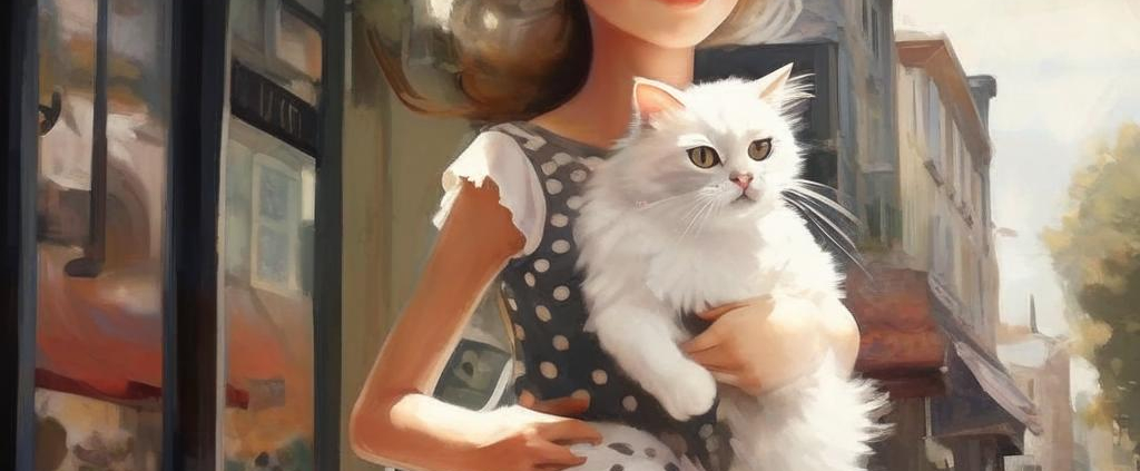 A whimsical girl with round glasses hugs her fluffy white cat on a quiet street corner