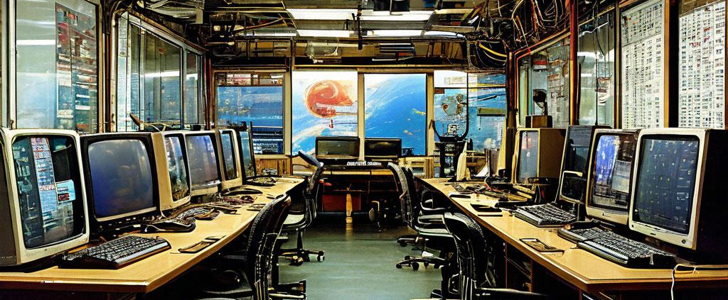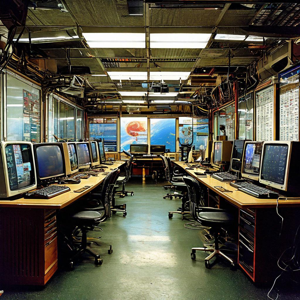 An 80s computer lab aglow with screens and wires
