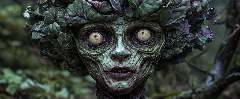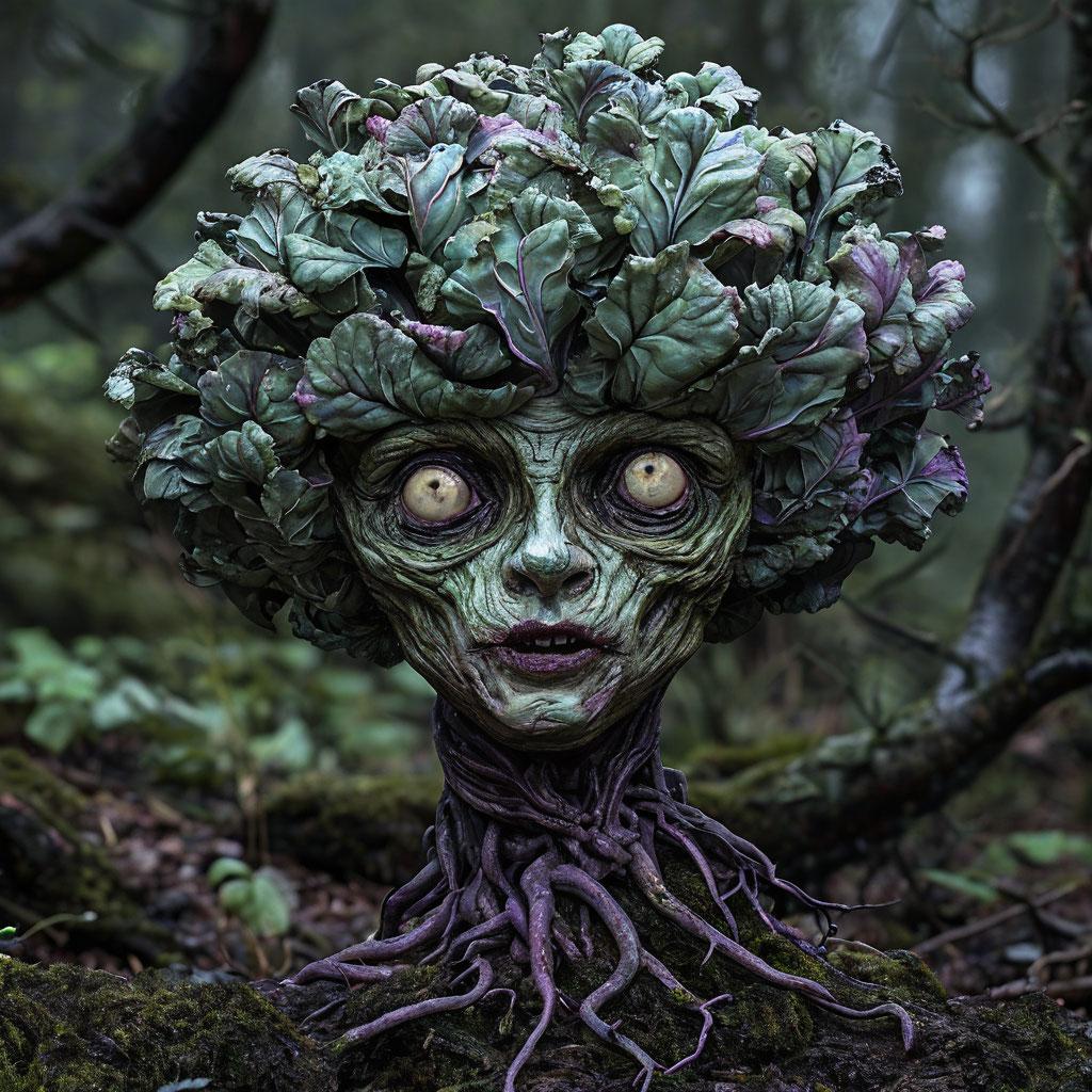 Award-winning folk horror still:** A grotesque cabbage head with brain-like leaves in pale green and bruised purple. Sunken eyes peer through twisted foliage