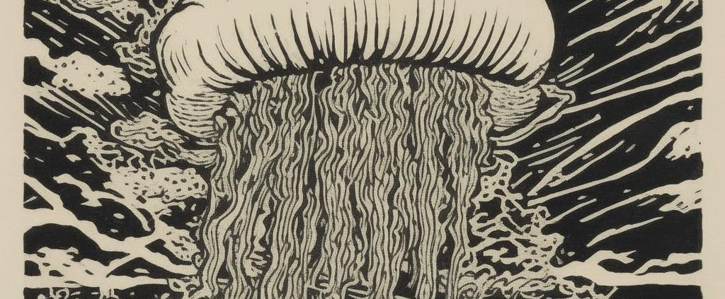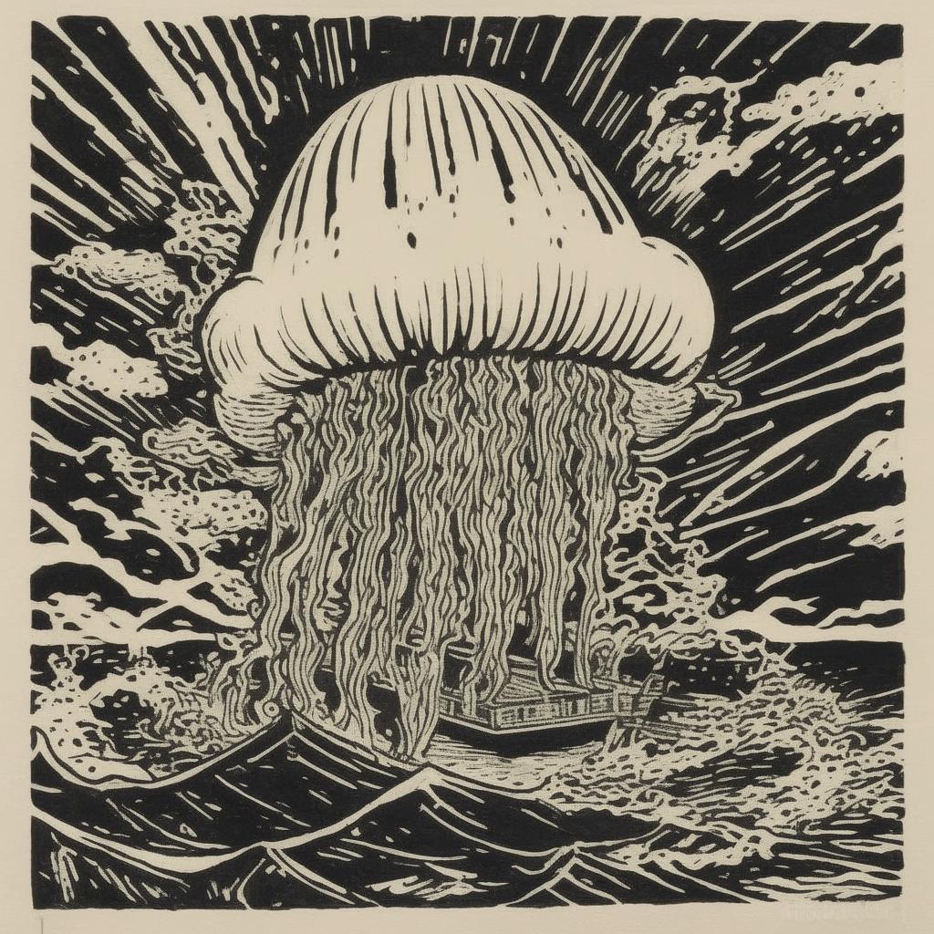 GOGOJIFAM” – 70s comic style giant jellyfish attacks oil rig in Japanese lino-cut ink art