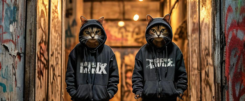 Grainy shot: angry cats in DMX hoodies press against a scratched Soviet door
