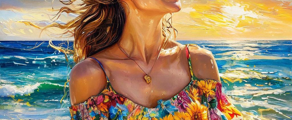Sunlight kisses her smile as she cradles a colorful world in her summer-dressed hands on the shore