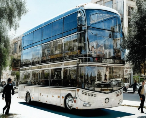 promptline 2025-08-24 08:28:57 2025-08-24 08:28:57 A three-story glass boutique bus glides through Tashkent’s sunny streets